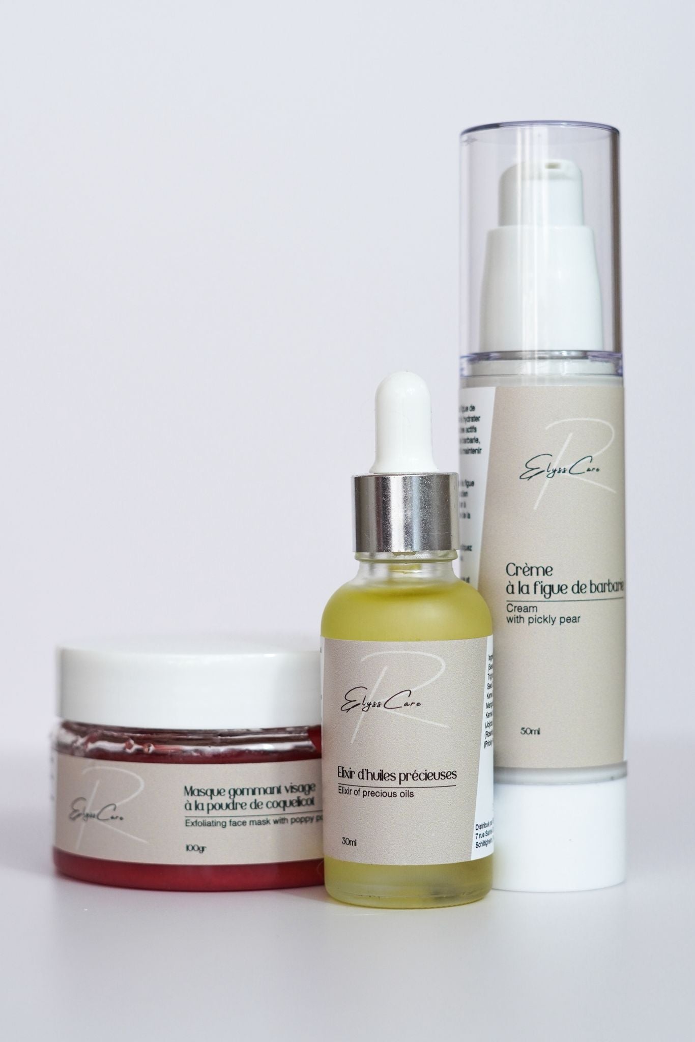 Vous trouverez dans notre Coffret ElyssCare : 1 Une huile nutrition intense : 30ml, 1 gommage à la poudre de coquelicot : 100g et crème hydratante à la figue de barbarie 50ml.
